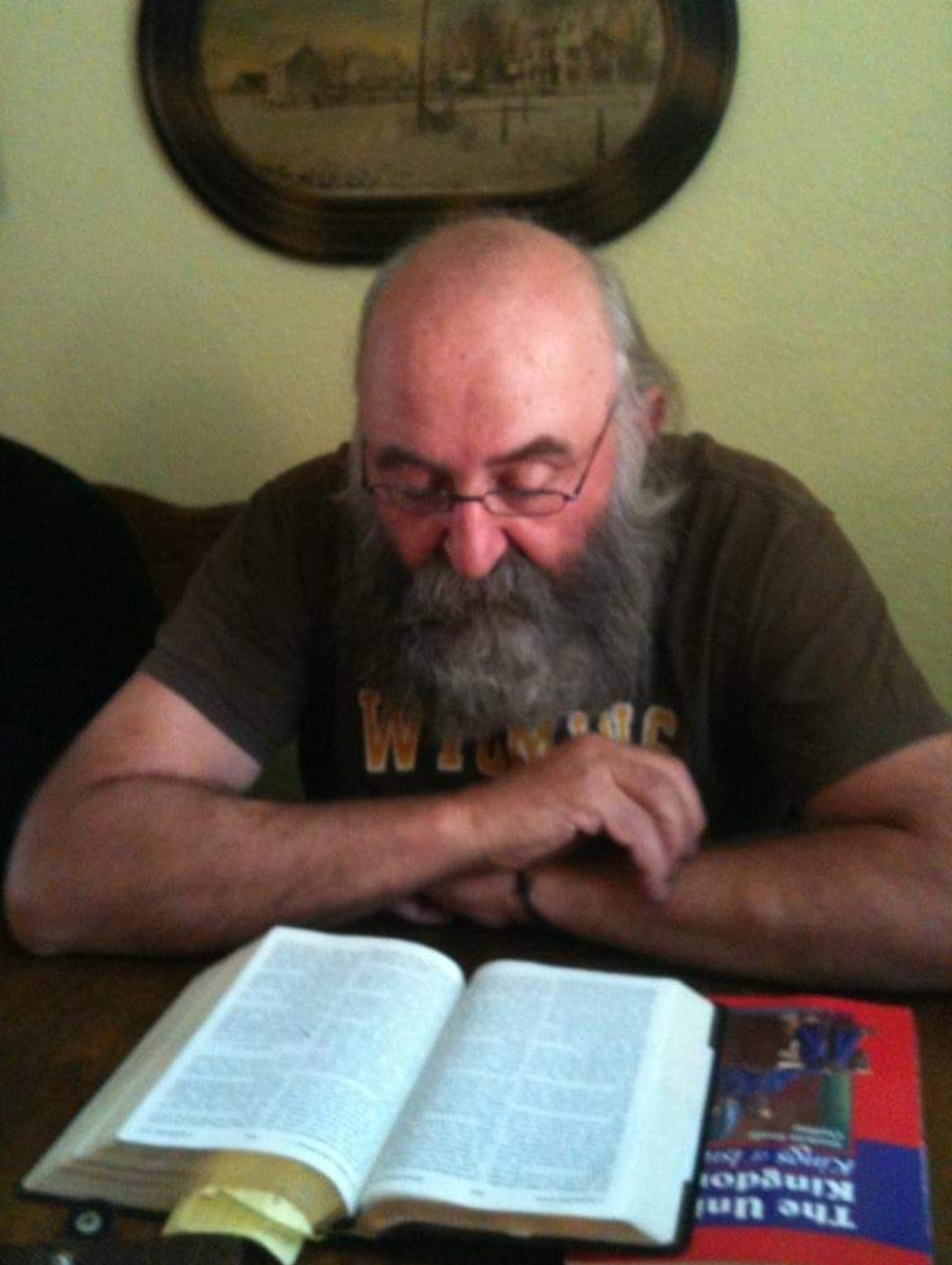 Terry feels the most important time of the day is when he does "Morning Prays" with his wife. He says that the mornings when that time together in the Word and prayer is skipped he feels at a loss. In this picture. He was reading a study on the Kings of Israel. An ABeka study.